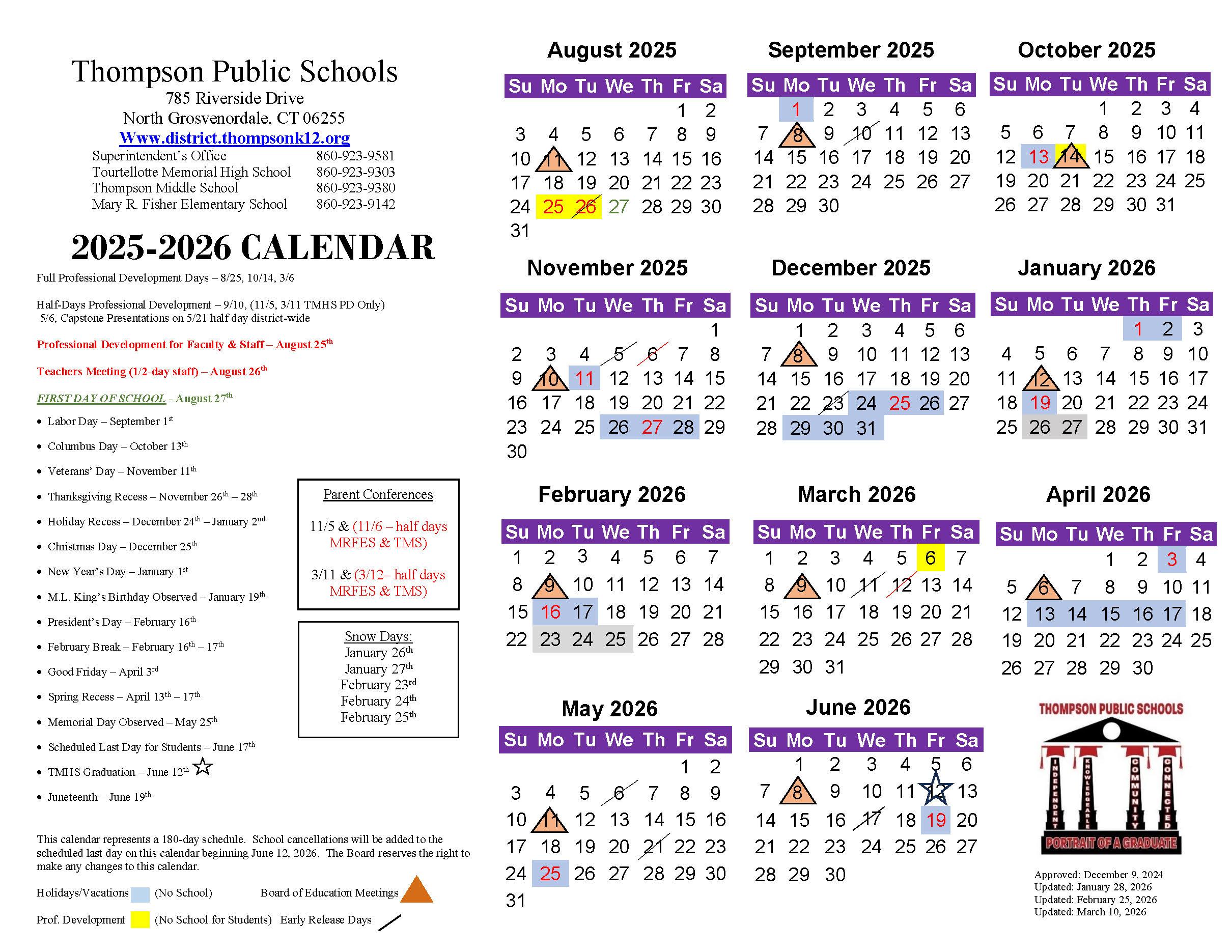 Updated 2025-2026 School Calendar The Thompson BOE approved to remove the May 22nd full PD day and change to a full school day. The last day of school is now June 17, 2026.